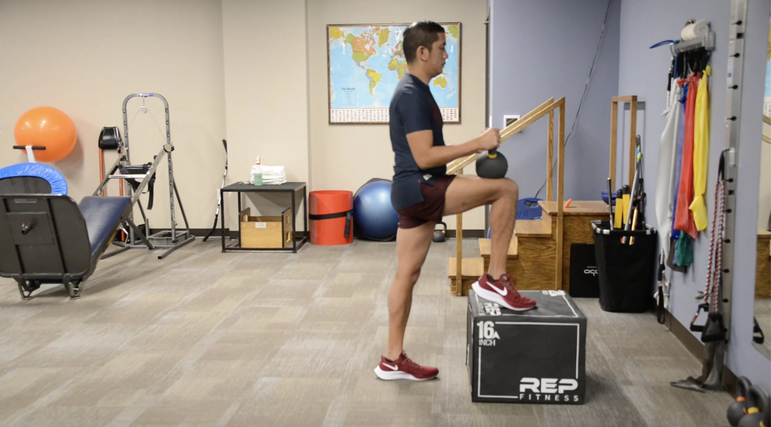 Go into a heel raise on one leg (10-20 degrees of plantarflexion is sufficient fo runners). Hold a kettlebell or dumbbell on the same side as the stance leg. Hold for 45-60 seconds. Rest for 1-2 minutes between sets. Perform 3 sets.