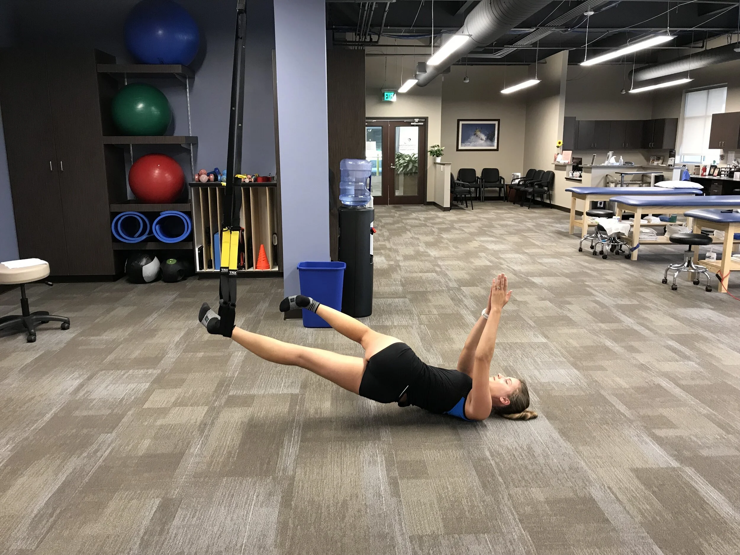 Lay on your back and place your leg in the suspension trainer (behind the knee for beginners, move lower dow towards the ankle for more advanced version). Raise your hips to come into a bridge position with your arms extended above your chest and palms together. Bring the free leg into 90 degrees of hip flexion and 90 degrees of knee flexion. Keep the sling leg stable and rotate your pelvis to bring your free leg over and under as if you were on a bbq spit. Shoulder blades may come slightly off the ground. Keep a neutral spine with your arms extended above you. All of the inward and outward twisting motion should come from the hips.