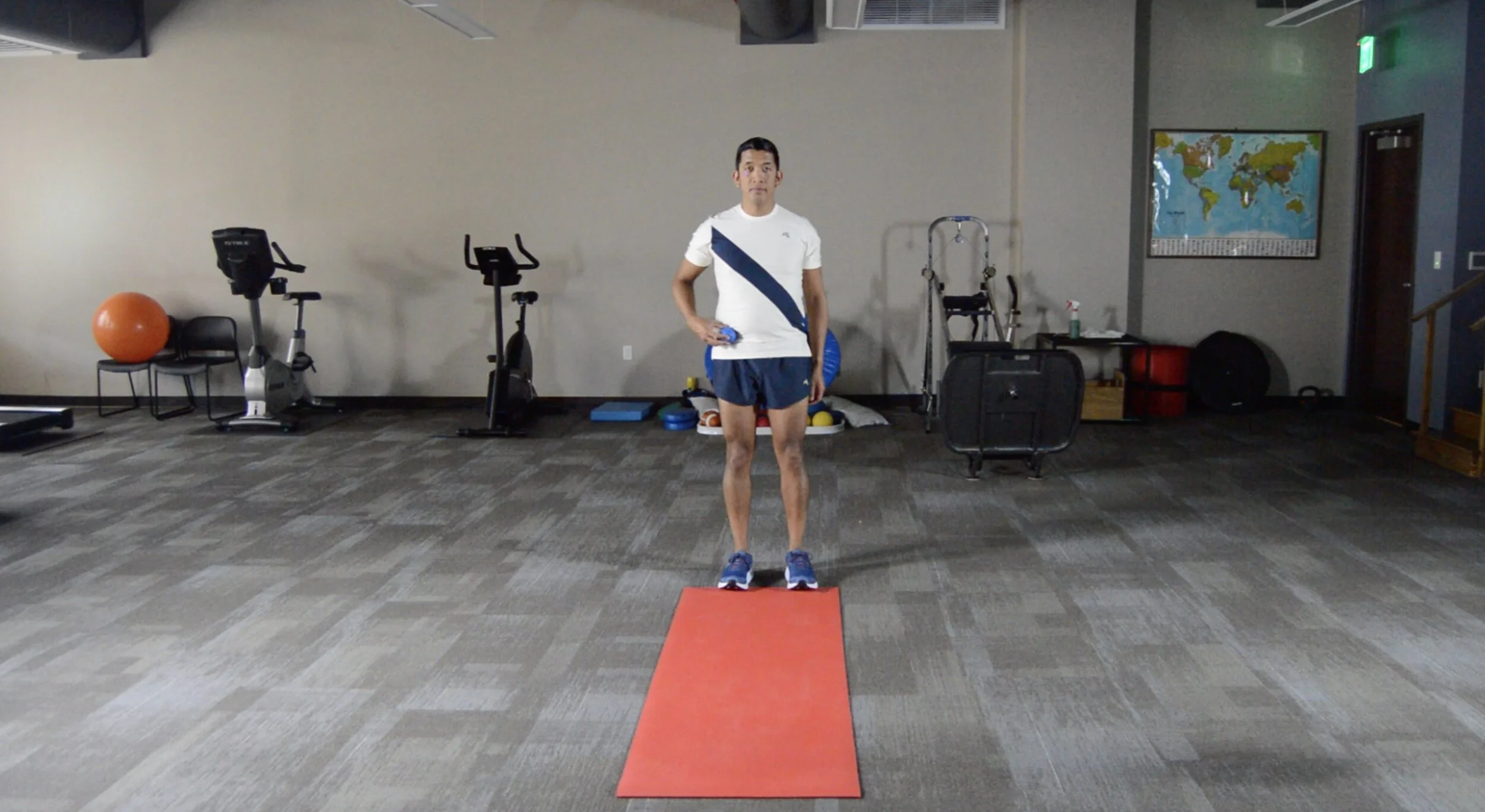 Lie on your back with knees bent and feet flat on the floor. Place the peanut-shaped massage ball under your mid-back at the bra line. Rest your head on the floor. Place a 1-3 lbs weight in each hand. Reach one arm up and overhead and exhale until the weight makes contact with the floor. Keep the opposite arm along your side. Perform 5 reaches on each side. Move down approximately 1 inch to the next vertebral segment. Repeat 5 reaches on each side. Continue until you reach the top of the thoracic spine.